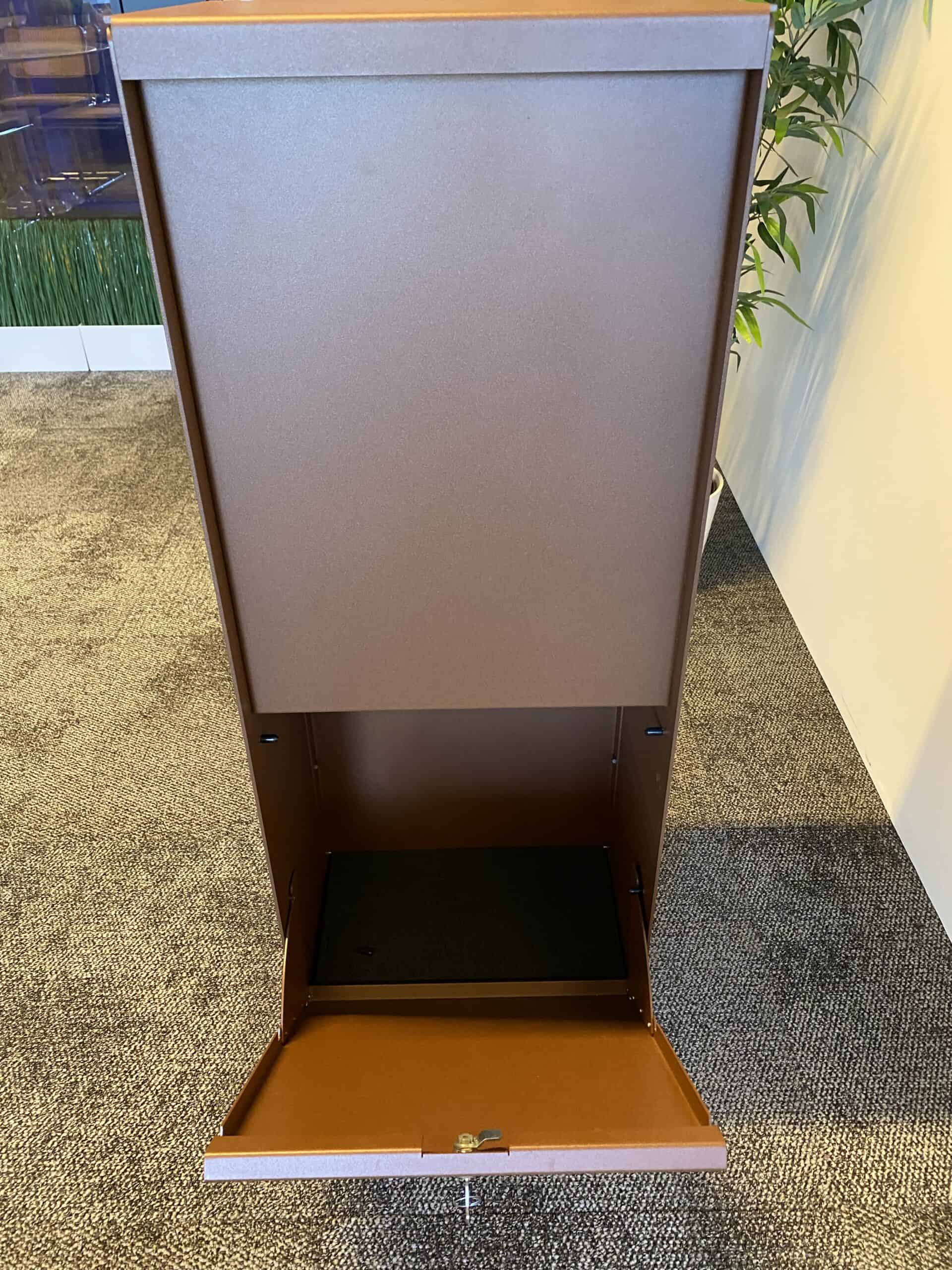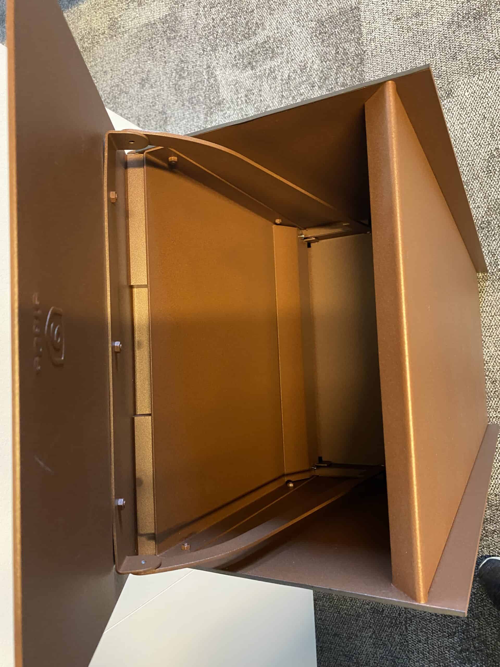 Deze Dropbox Small in RAL 8004 Cortenstaal look is altijd één van de pronkstukken geweest in de showroom van Pakketboxen.be in Hasselt. Hij ziet er nog altijd bijzonder mooi uit in de hoogwaardige ‘Cortenstaal’ structuurlak. Op zoek naar een moderne pakketbrievenbus met een landelijke toets? Dan is dit – letterlijk én figuurlijk – één van de mooiste deals!